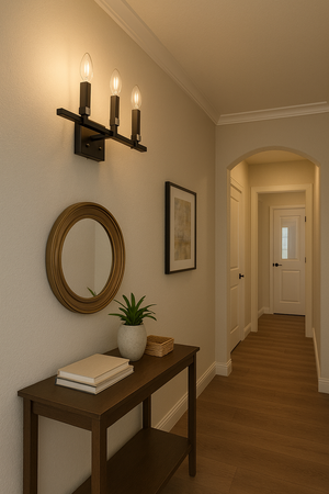 • This clean modern design is suitable for transitional to contemporary homes. The black and nickel finishes and the candelabra style lights continue the elegant look. This wall light is an excellent idea for your bathroom mirror or bedroom, powder room, living room, dressing table, doorway or entryway, corridor, foyer, or bar coffee shop.