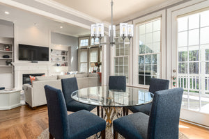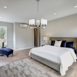 The Tia 5-light polished nickel cylinder chandelier's clean lines and white glass give it a modern feel. This is a great modern chandelier for living room, dining room or bedroom.