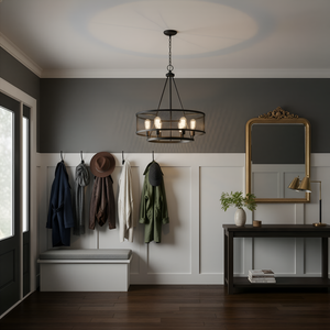 The Elza 6-light pendant's ultra-modern matte black finish and semi-exposed bulbs combine to make a stunning piece that is perfect for industrial chic, modern farmhouse, and edgy living spaces. The circular pendant base is surrounded by a metal grating, creating a beautiful lighting pattern.
