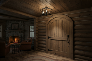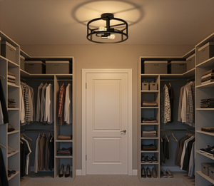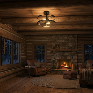 The Charles Collection from Vivio Lighting introduces the 2-Light Round Open Semi-Flush Mount Lighting. The Charles 2-Light Round Semi-Flush Mount extends downward from the ceiling 6 inches and has both bulb bases curve outward in opposite directions. The circular open cage is supported by a beam at the top.