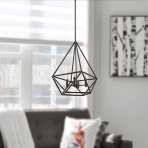 The Vega-4 light cage pendant's matte black finish and semi-exposed bulbs combine to make a stunning piece that is perfect for industrial chic, modern farmhouse, and edgy living spaces. The bulbs are surrounded by a metal grating, creating a beautiful lighting pattern.