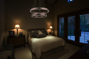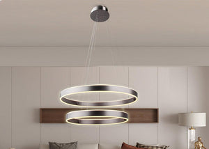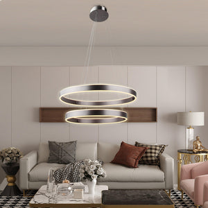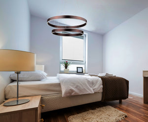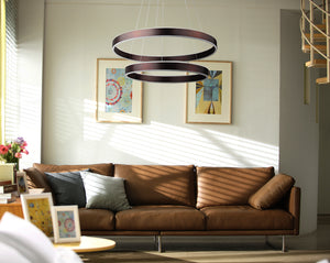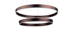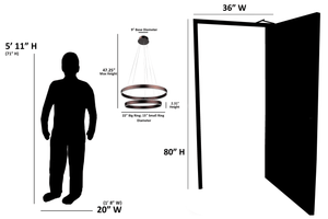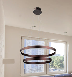 AVA is a new double ring chandelier design by Vivio. Its illuminating rings bring a modern feel to any space, while its sleek finish will give an area a sense of elegance. It features a Coffee Brown Plate and Coffee Brown Base. The dimensions are (HxW) 47.25" x 23.75".