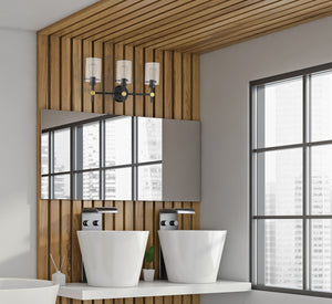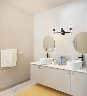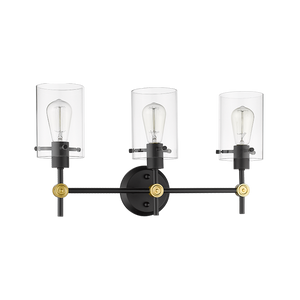 This beautiful mid-century modern vanity light features clear cylinder glass shades and a matte black metal frame with gold accents. This vanity can be used for bathroom vanity light fixtures and offers reliable illumination with an industrial design. This model uses (3) 60 Watt medium base bulbs. For even brighter lighting, try using one of our LED replacement bulbs. The clean lines of the frame add interest while the clear glass shades give a unique look to the light, enhancing many spaces. The KIRA is conveniently sized for interior design purposes and works well with both traditional and modern schemes.