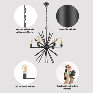 MID CENTURY DESIGN: Unveil the allure of modern mid-century aesthetics with our matte black sputnik chandelier. A mesmerizing blend of eras that adds sophistication to your space.
