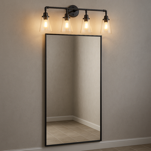 The Milla vanity light features clear glass shades and a matte black metal frame. This vanity can be used for bathroom vanity lighting and offers reliable illumination with an industrial design. This model uses (4) 60-watt medium base bulbs. For even brighter lighting, try using one of our LED replacement bulbs. The Clean lines of the frame add interest while the clear glass shades give a unique look to the light, enhancing many spaces. The Milla is conveniently sized for interior design purposes and works well with traditional and modern schemes.