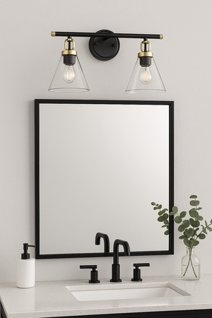 This 2-light vanity has the ability to blend in with any type of décor. Brighten your bathroom mirror in a clean, contemporary design with this fixture. It's made from steel and features champagne gold rings connected with the matte black bulb bases and horizontal arm that enhances the elegant look.