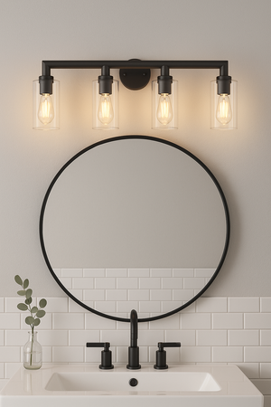 This vanity light is a built-in sturdy metal arm with a matte black finish and clear cylinder glass shades. The sturdy silhouette in a matte finish creates a more exquisite and luxurious feeling for your home lighting. This mounted wall light can be installed upward and downward, which perfectly matches your bathroom, mirror cabinets, vanity set, etc.