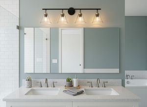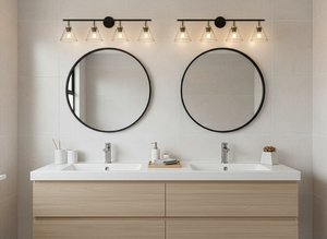 This 4-light vanity has the ability to blend in with any type of décor. Brighten your bathroom mirror in a clean, contemporary design with this fixture. It's made from steel and features champagne gold rings connected with the matte black bulb bases and horizontal arm that enhances the elegant look.